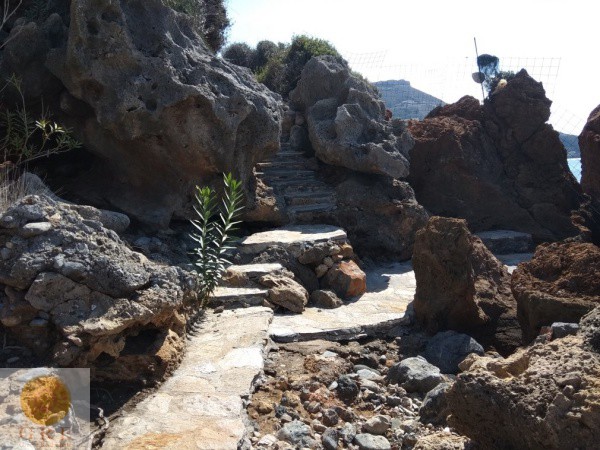 החלקה מלאה בעצי זית וחרוב והגישה הפרטית לים קלה דרך שביל אבן טבעי.