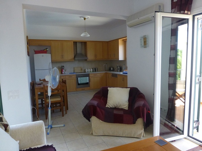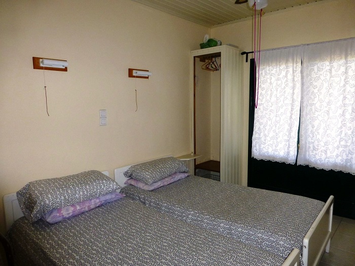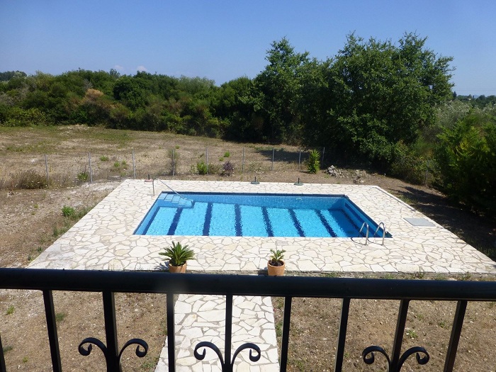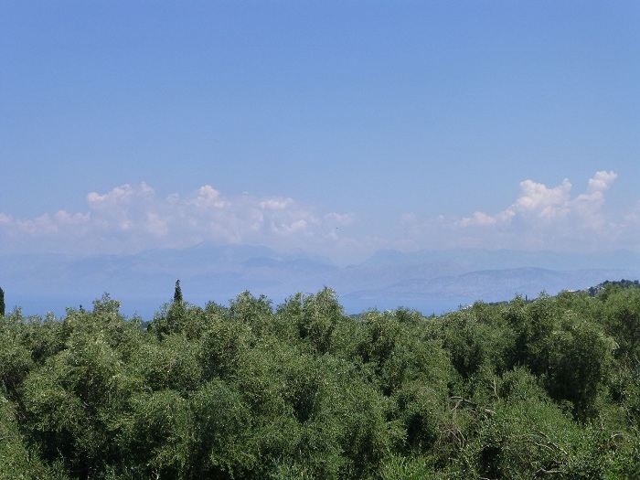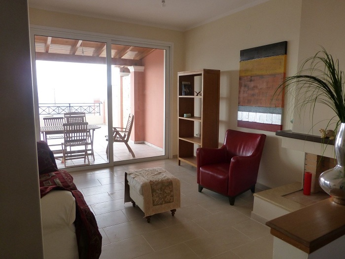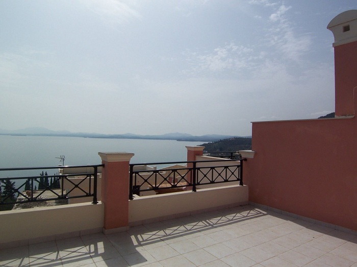 קומה עליונה: חדר מואר עם אח עצים ודלתות פטיו המובילות למרפסת קטנה עם נוף נרחב לים, ולמנזר המפורסם בפאלאוקסטריטסה (Paleokastritsa).