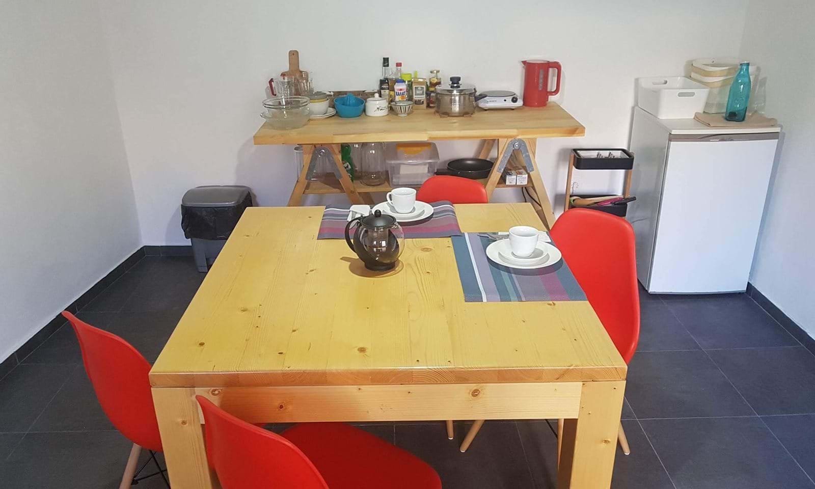 ישנו מטבח/חדר אוכל גדול שטוף שמש ומודרני, עם יחידות מצוידות וחלונות המשקיפים על הסמטה, החדר נעים ומסביר פנים, פתח מוביל החוצה אל הסמטה.