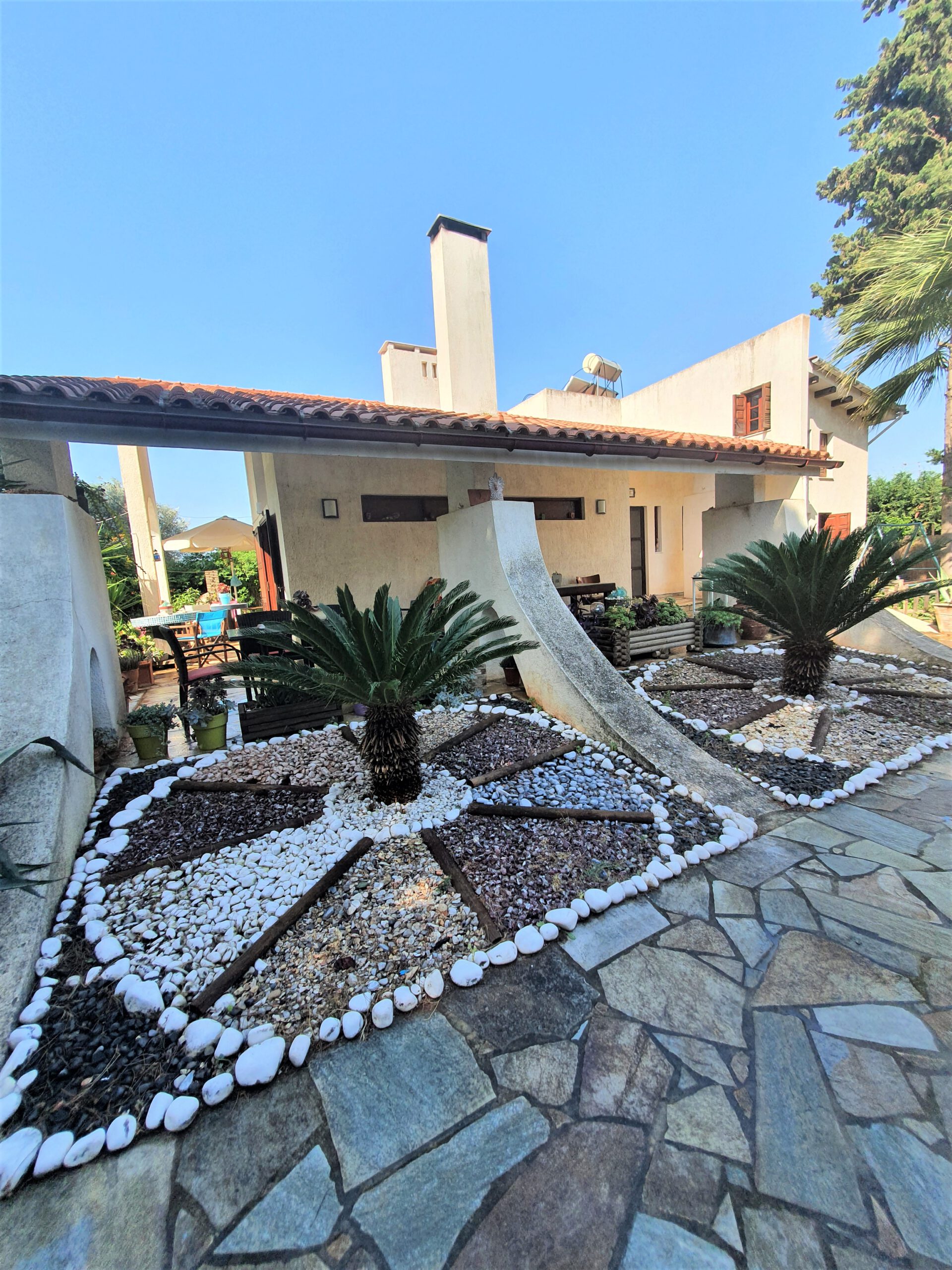 הבית נמצא באזור קאימנטי במגרש של 1007 מ"ר ויש בו גם 27 מ"ר שטח עזר. היתר הבנייה היה משנת 1980 אך הבנייה החלה בשנת 1990 והבניין הושלם בהדרגה, הבית אוכלס לראשונה בשנת 2002. במגרש שתי כניסות, גינה מעוצבת עם מערכת השקיה אוטומטית, מקדחה, מנגל ותנור בנוי, שלושה מקומות חניה.
