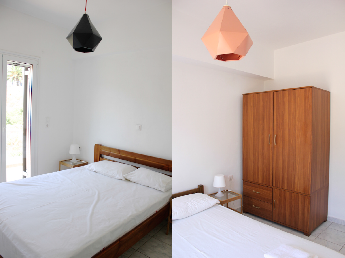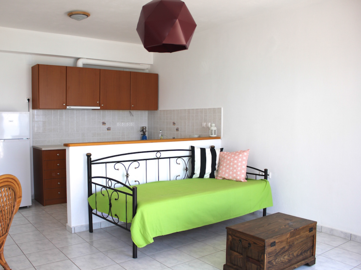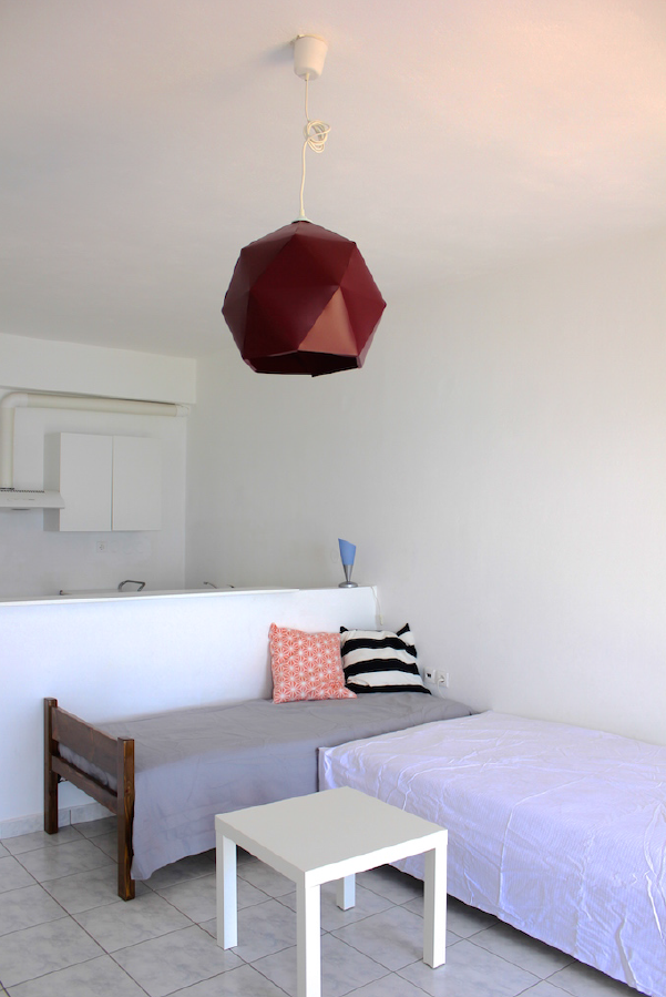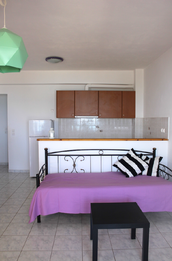 הסלון, מטבח ופינת אוכל בחלל משותף. לכל יחידה יש מרפסת גדולה עם נוף ייחודי לאי אגינה ולמפרץ הסרוני.