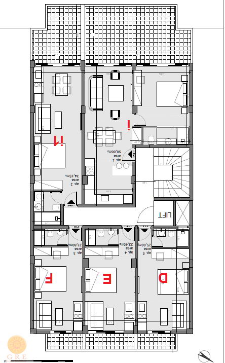 בקומה הראשונה חלל עבודה משותף/משרדים, בקומות 1-4 שש דירות סטודיו(כ 30- מ”ר+מרפסת), בקומות 5-6 שני מיני פנטהאוזים (כ – 45 מ”ר+מרפסת גדולה), ובקומה השביעית פנטהאוז בשטח כל הקומה עם גג עצום.