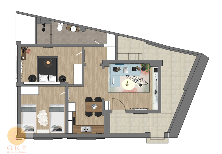 הדירה ממוקמת בקומת הקרקע. היא כוללת 2 חדרי שינה, סלון עם מטבח ושירותים עם מקלחת.