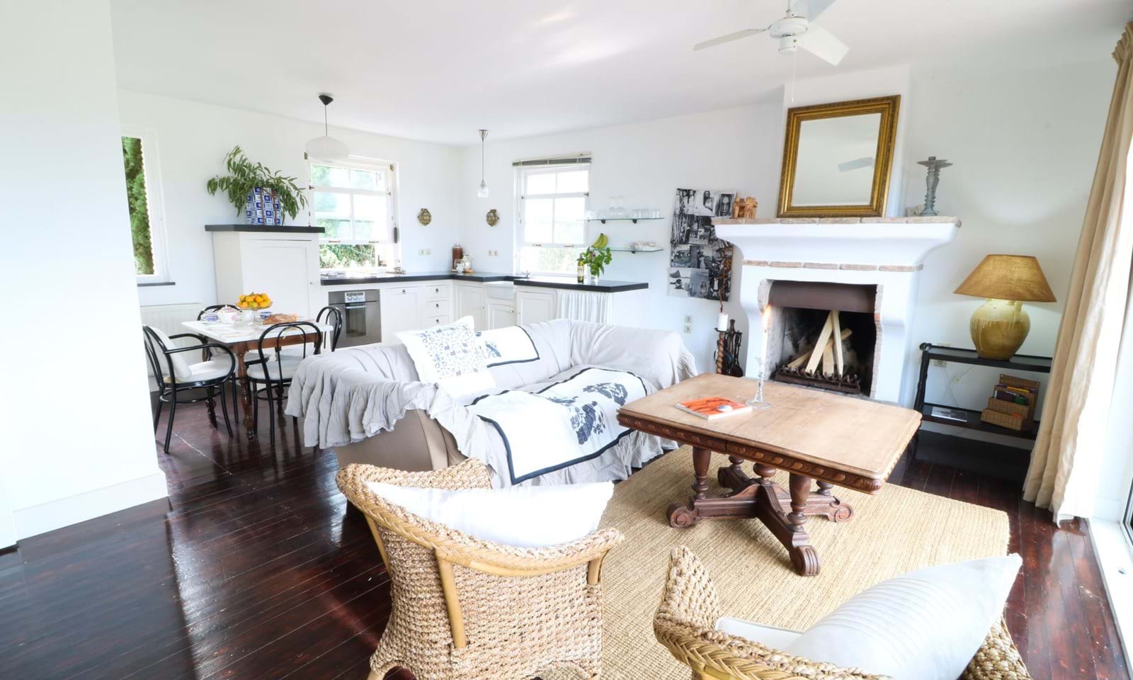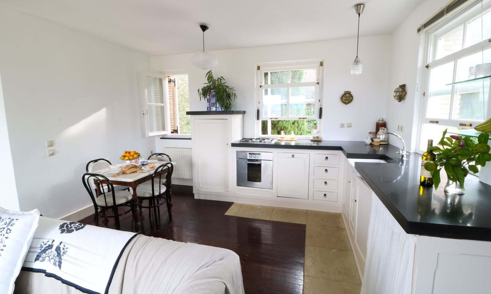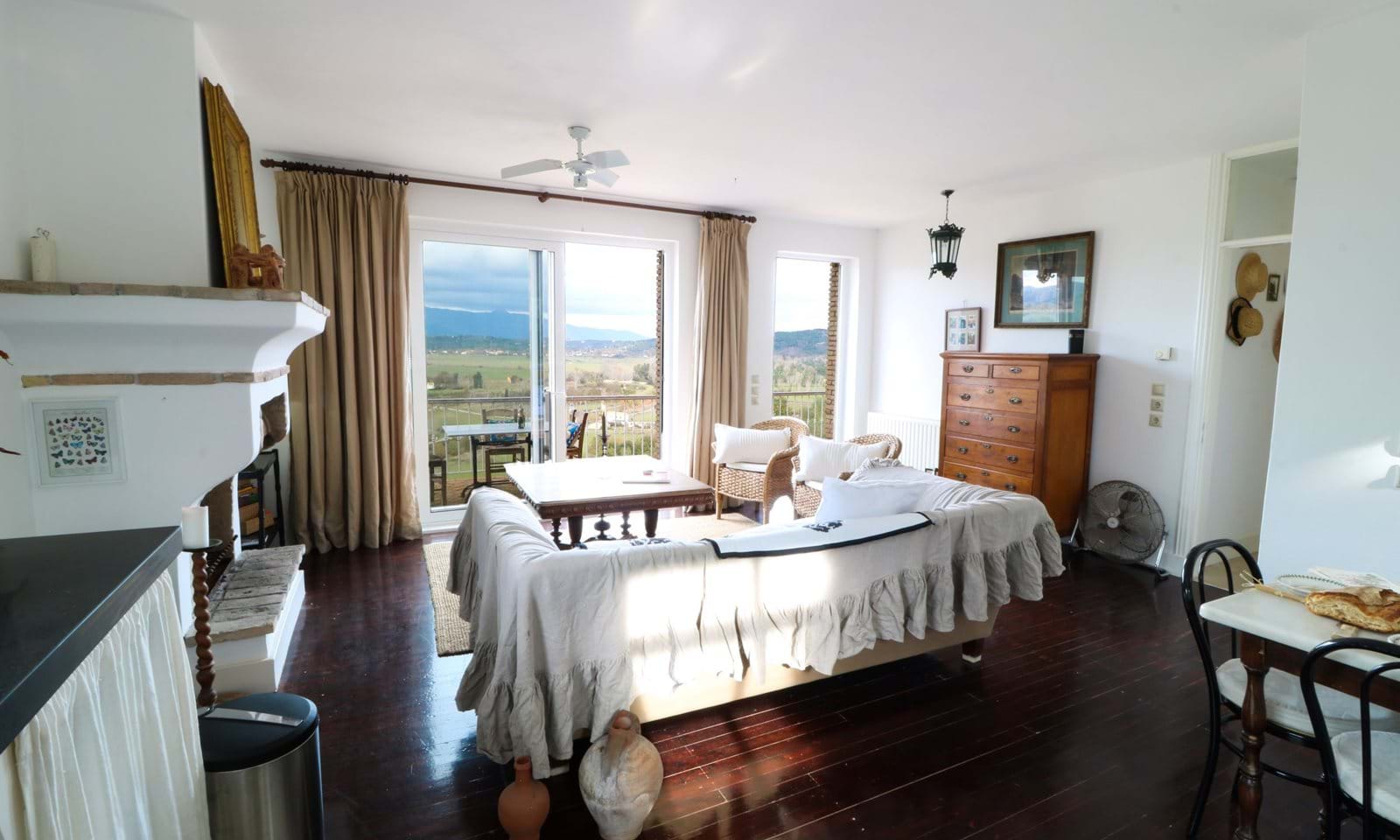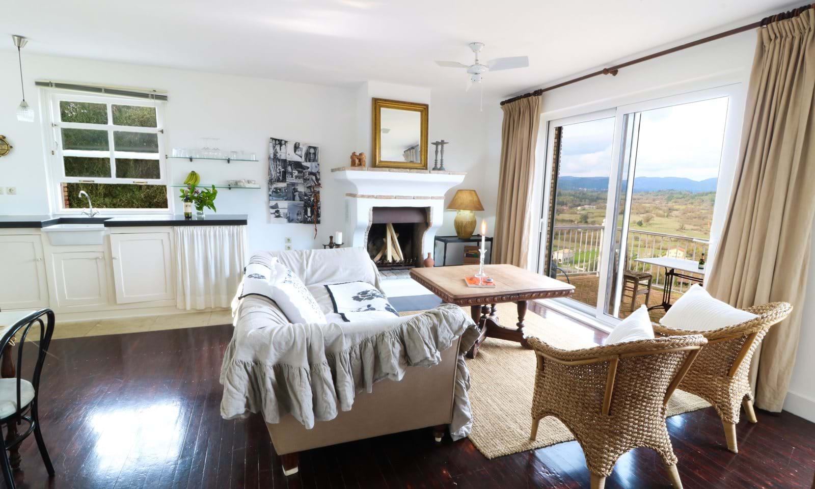 המסדרון ממשיך אל חלל המגורים הפתוח, כאשר המטבח מאחור ודלתות המרפסת מהרצפה עד התקרה מכניסות פנימה את הנוף המואר והמקסים. יש אח יפה, אידיאלי לערבי חורף. בחוץ יש מרפסת המשקיפה על העמק.