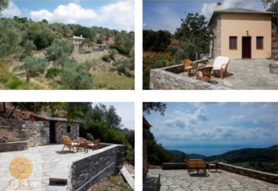 שתי דלתות כניסה מובילות למרפסת גדולה עם נוף יפה של 180 מעלות לים האגאי ולאי אוויה (Evia).