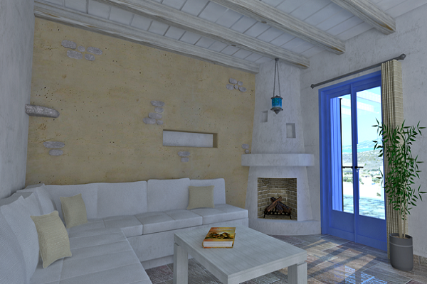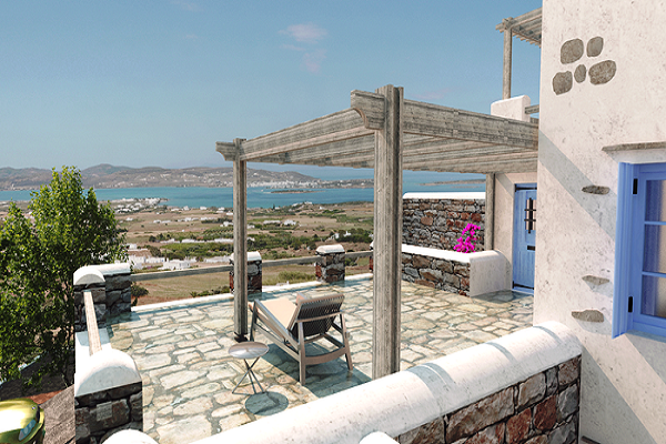 – שני חדרי שינה עם תקרת עץ מסורתי, קיר עם אלמנטי אבן ומרפות עם נוף נפלא לים ולאנטיפארוס.
