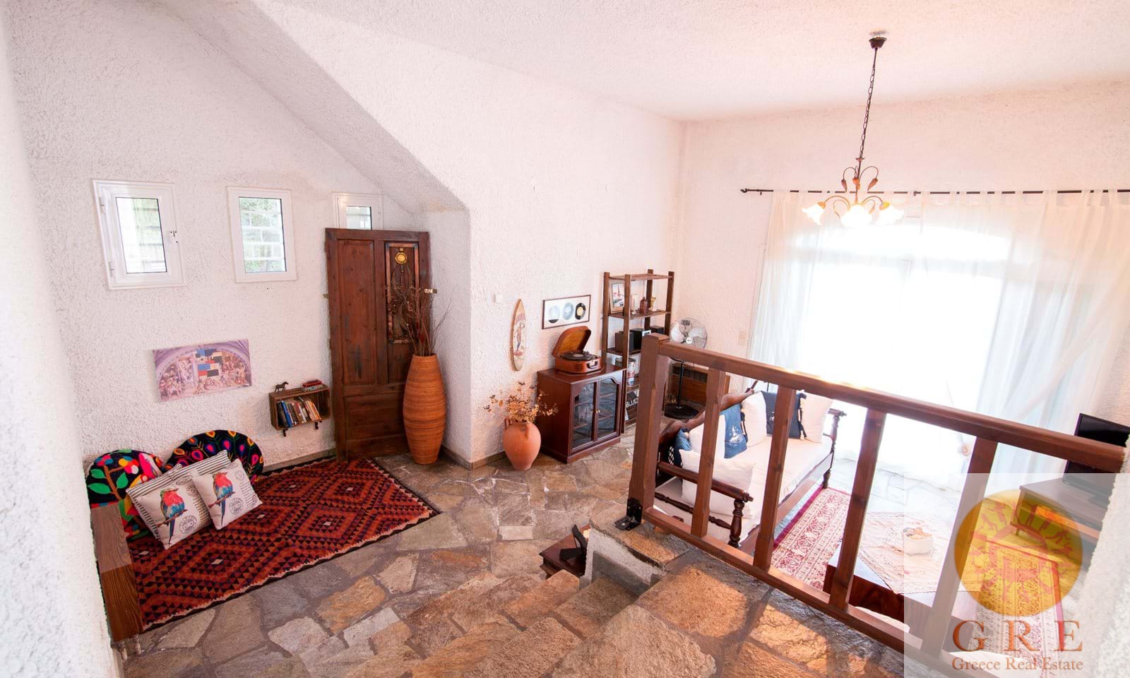 הכניסה הראשית מובילה לסלון המאובזר באח פתוחה ואחד מ4 חדרי שינה. כמה מדרגות למעלה נמצא המטבח עם דלת נוספת לגישה לפטיו המקורה/אזור הברביקיו החיצוני ולבריכת הצלילה הקטנה המקורה.