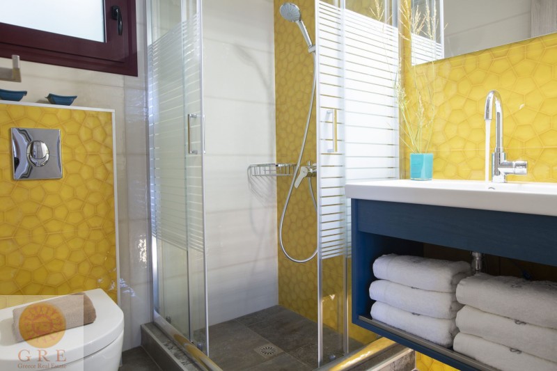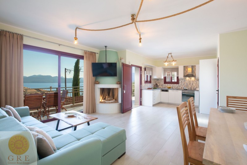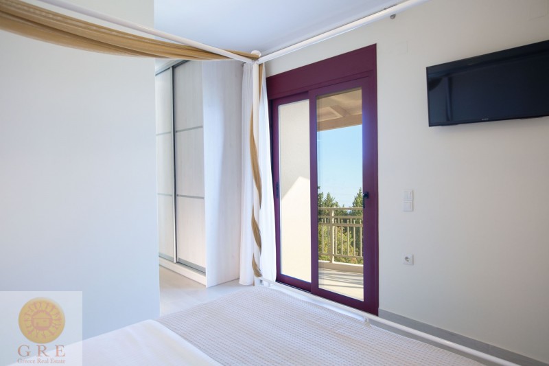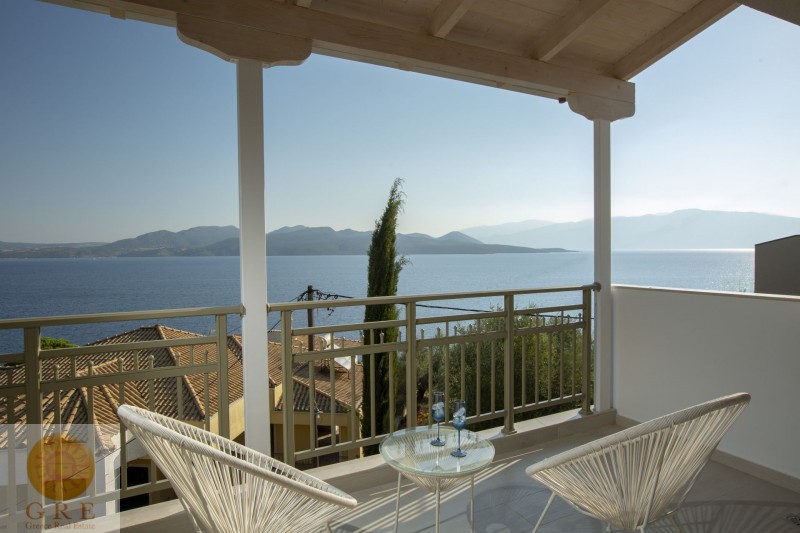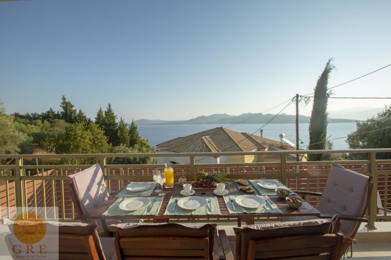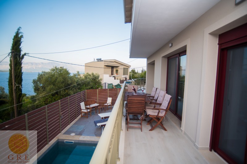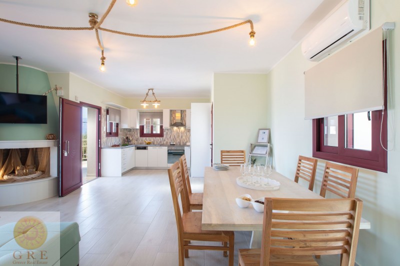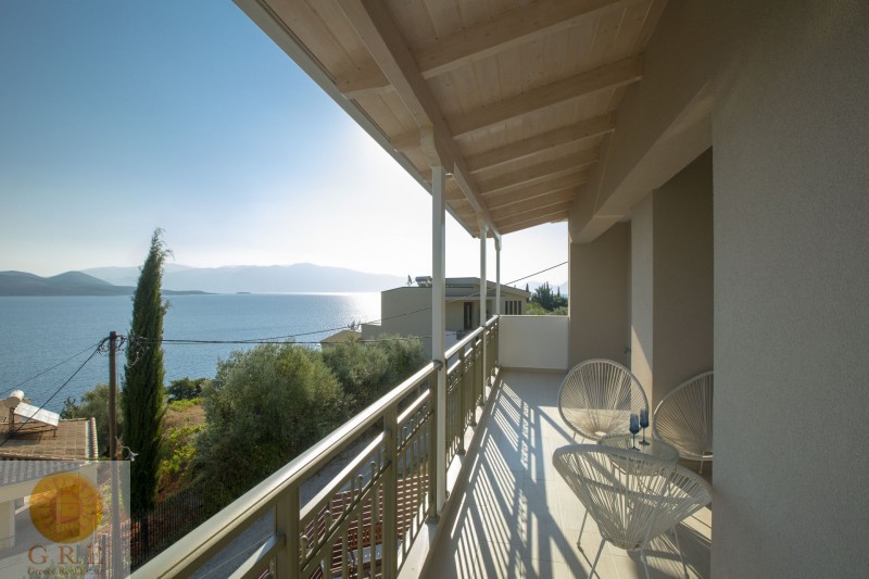 לוילה יש מרפסת מדהימה המשקיפה לנוף הנהדר של המים הכחולים היוניים.