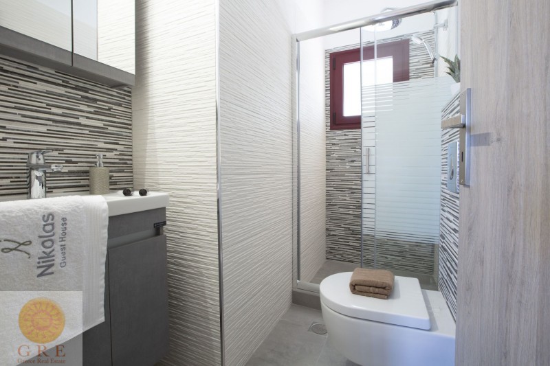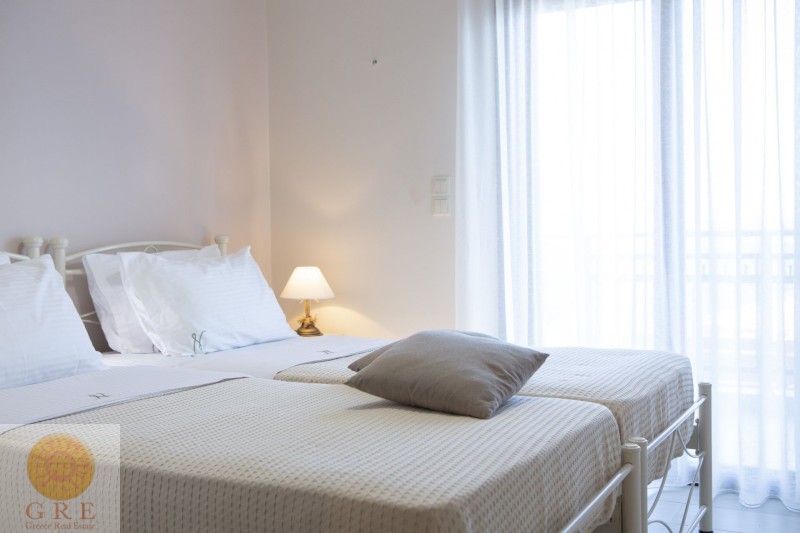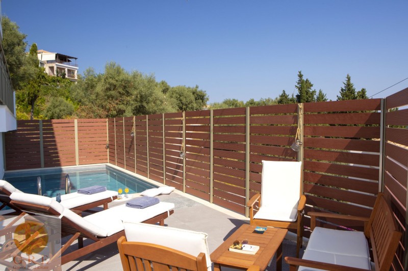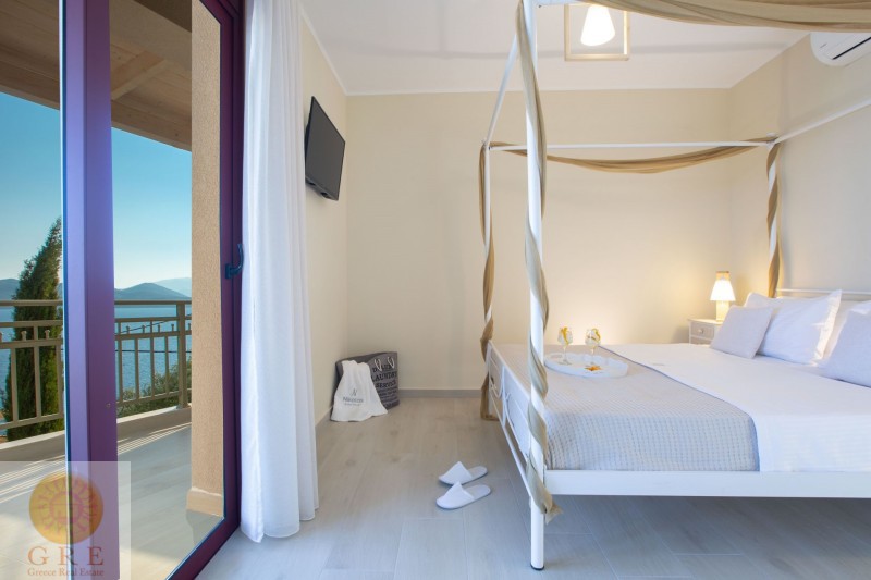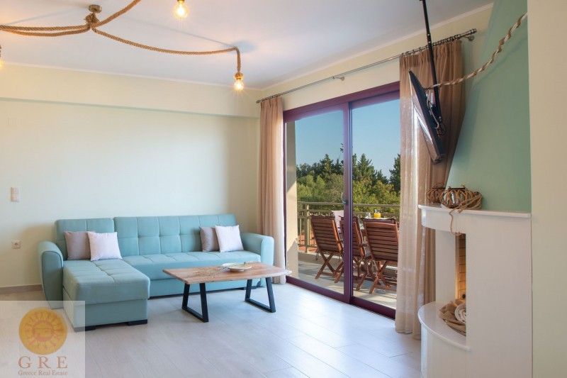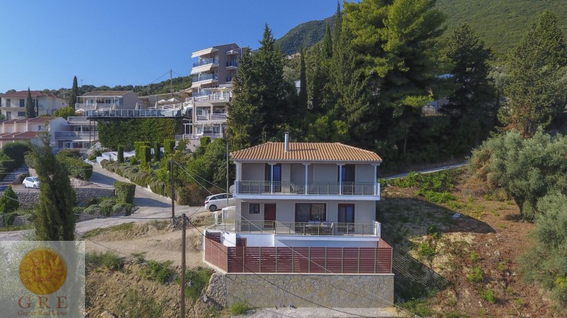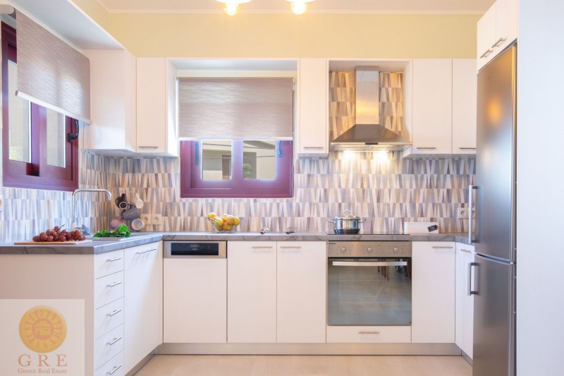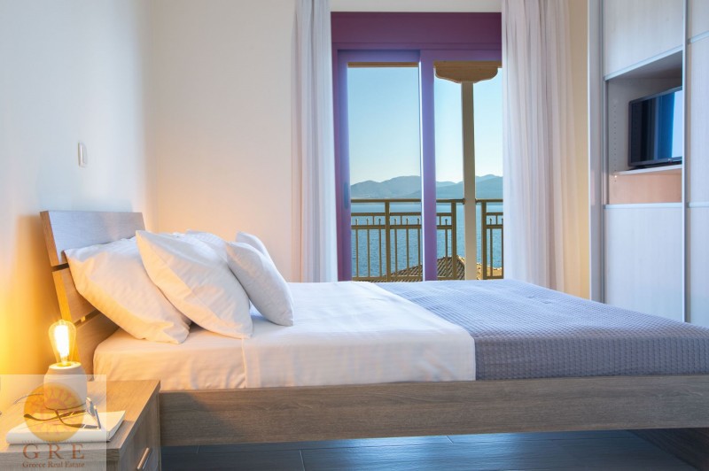 לוילה יש מרפסת מדהימה המשקיפה לנוף הנהדר של המים הכחולים היוניים.