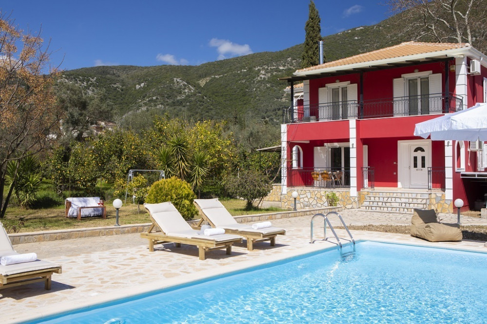 וילה דו-מפלסית עם בריכת שחייה, מוקפת בצמחייה שופעת בשכונה שקטה באזור נידרי.