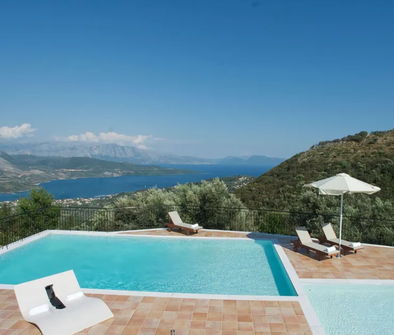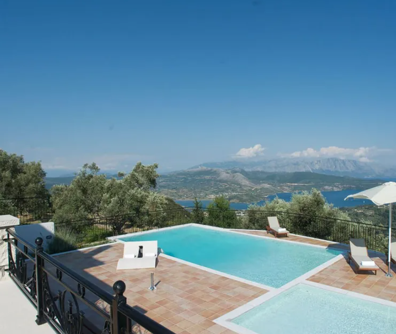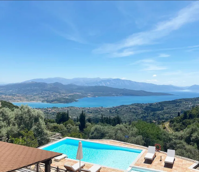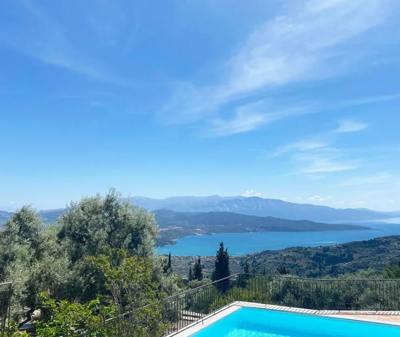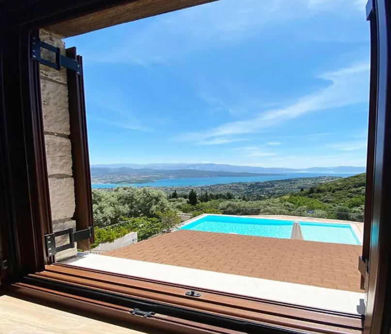 מרפסת משקיפה לנוף ים כחול טורקיז, סביב נוף ירוק משכר חושים