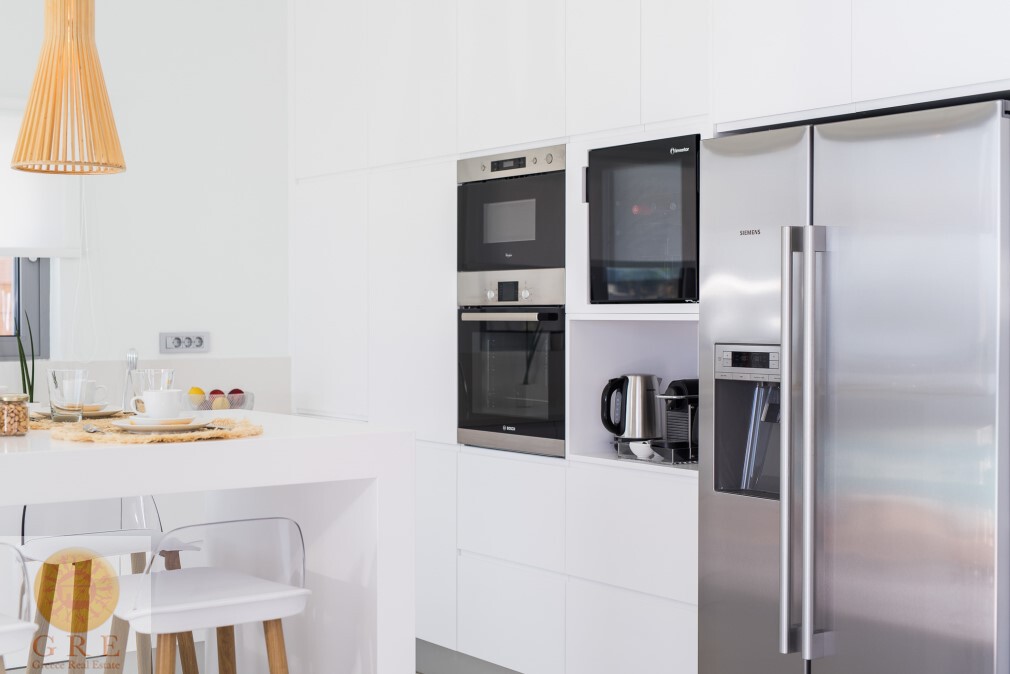 המטבח המעוצב המאובזר כולל ספסל אי ל-8 אנשים והוא מאובזר במלואו בתנור, כיריים עם 4 סירים, מיקרוגל, מחלץ, כיור, מקרר עם דלת כפולה, מקרר יין וכל מכשירי החשמל הקטנים הדרושים.