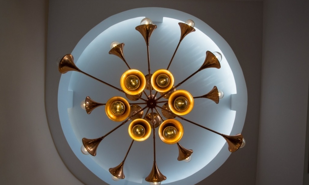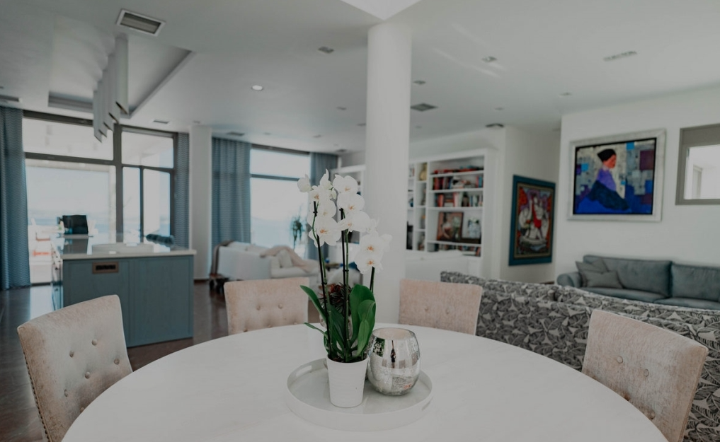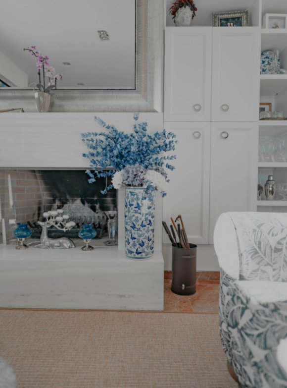 בכניסה חלל פתוח המעוטר בגוונים מרגיעים של לבן עם פרטים עזים של כחול ונחושת.