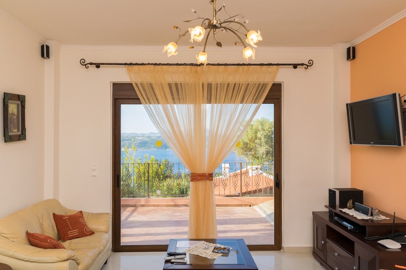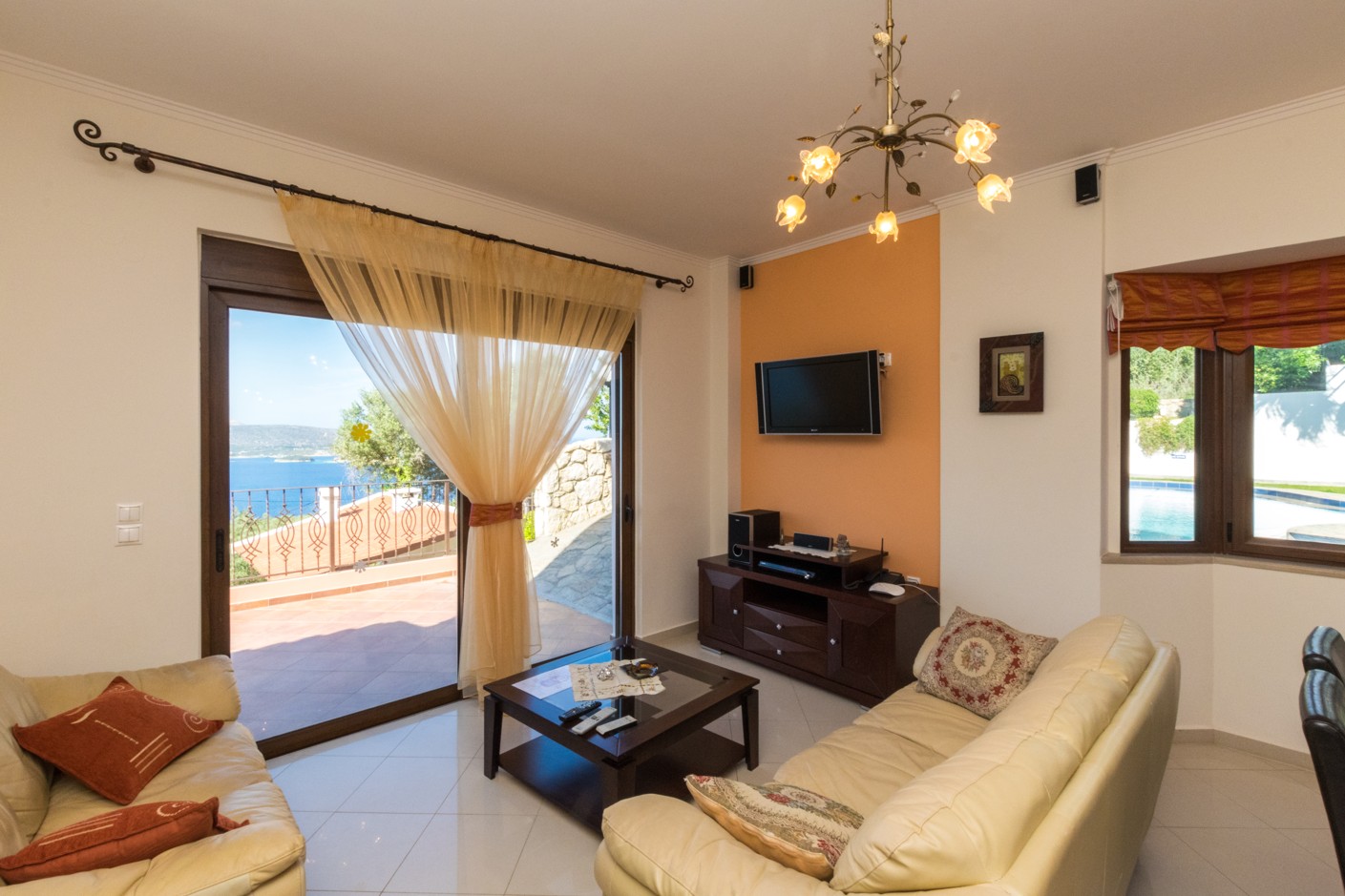 לסלון דלת זכוכית גדולה הנפתחת למרפסת מקורה עם נוף פנורמי מדהים, תוך כדי נוף לבריכת השחייה היוקרתית.