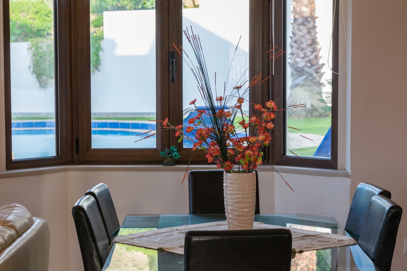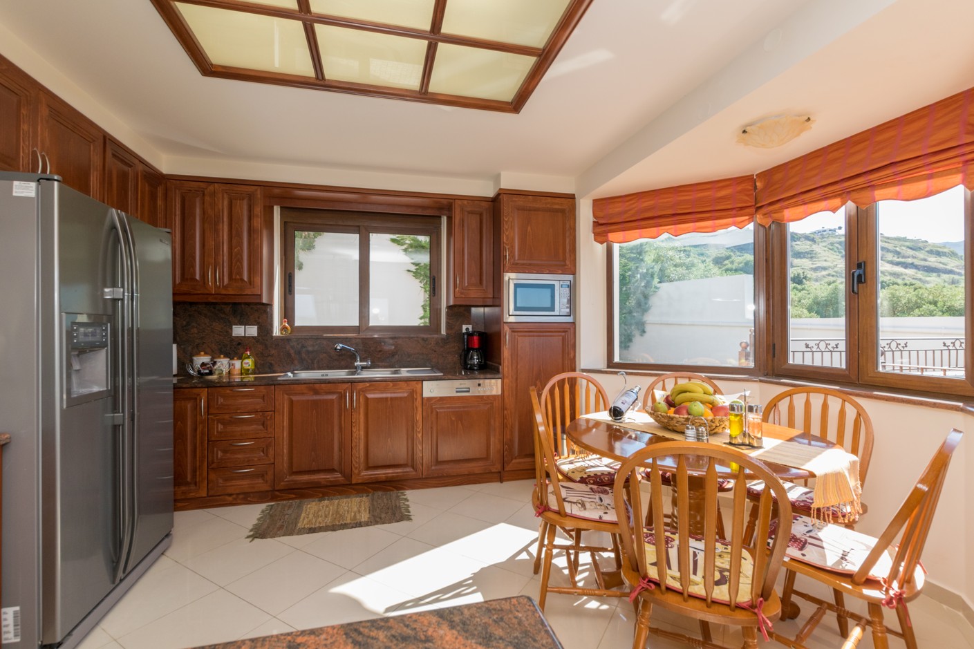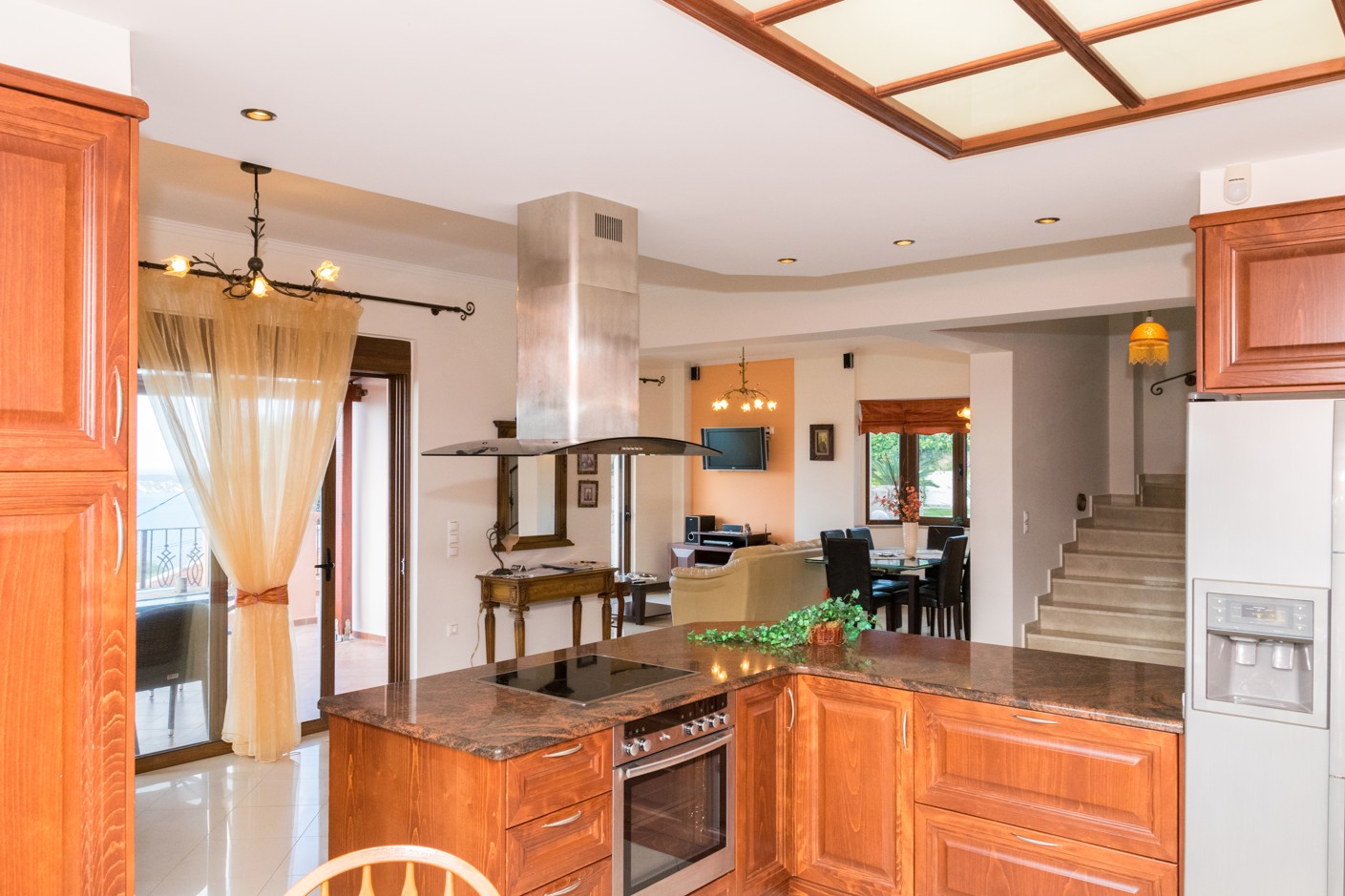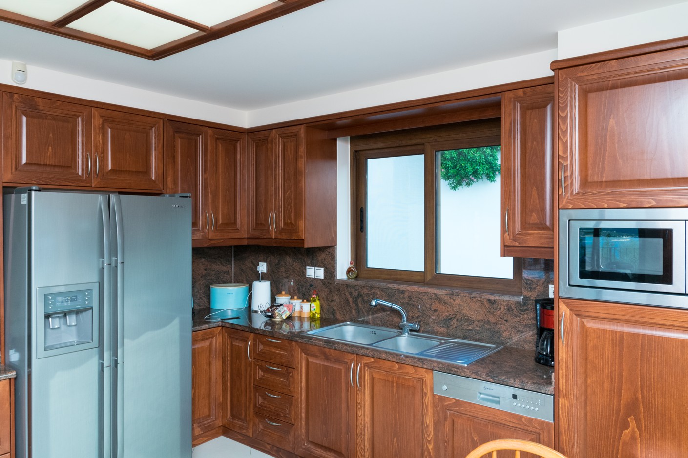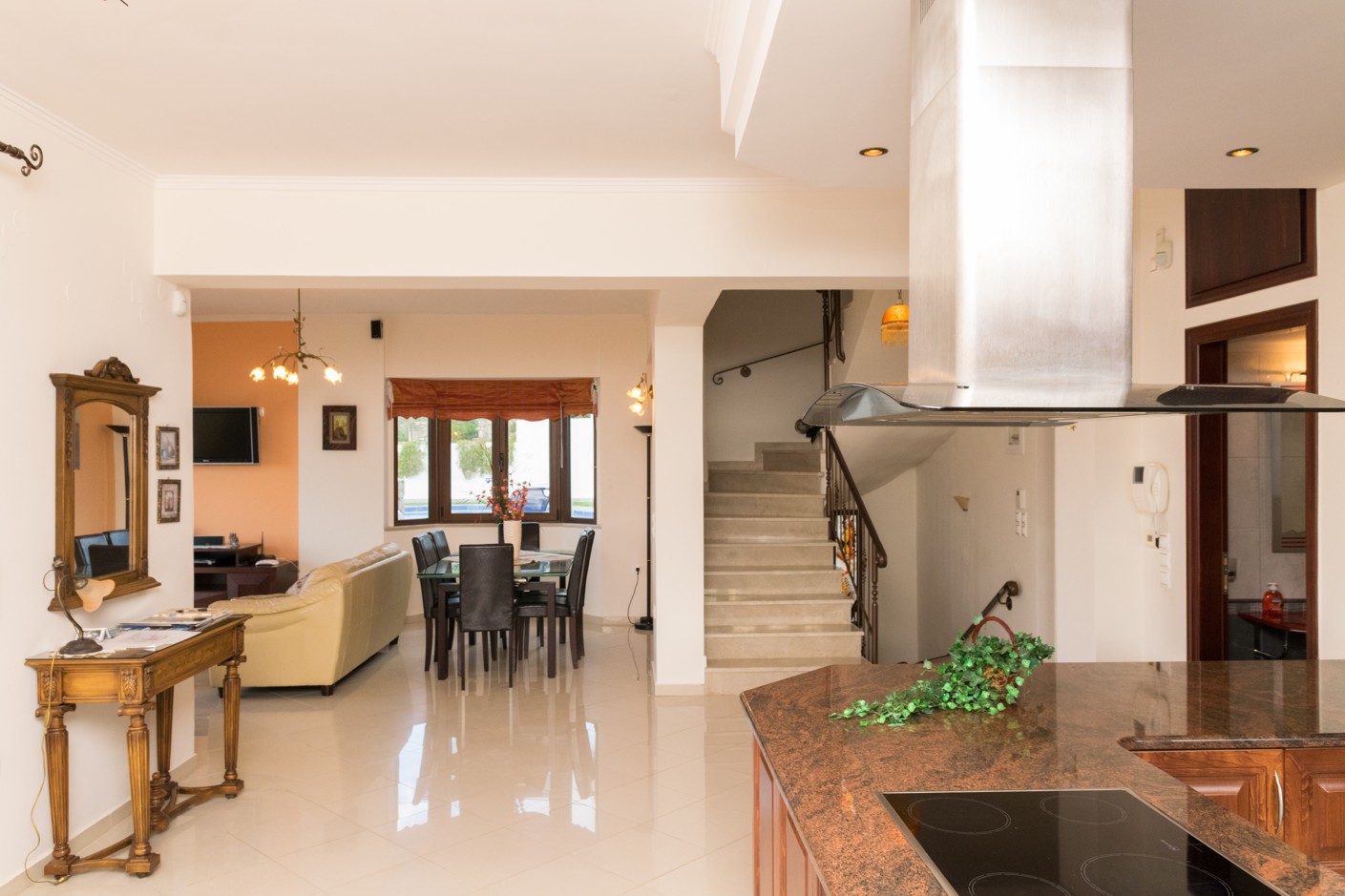 עם הכניסה לוילה, אנו מוצאים את עצמנו בשטח הפתוח הענק עם סלון ופינת אוכל, וכן במטבח המודרני עם ארונות יפהפיים, ומאובזר בכל מוצרי החשמל.