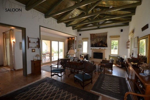 אח בסלון, מרפסת מקורה עם נוף לירוק.