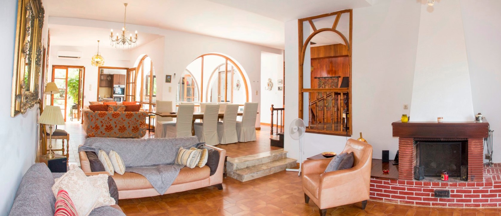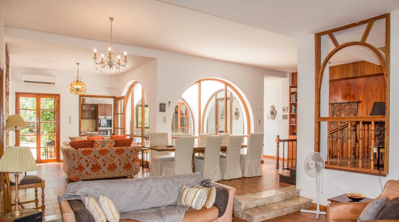 הטרקלין המפוצל מורכב מ-2 חלקים, אזור ספות במפלס התחתון ואזור מפלס עליון עם שולחן האוכל. השטח התחתון מצויד באח ויחידת מיזוג אוויר. דלתות פטיו הזזה גדולות נפתחות אל המרפסת המקורה המקושתת, אידיאליות למגורים בחוץ, גישה לגינה ונהנית מנוף נהדר של הים.