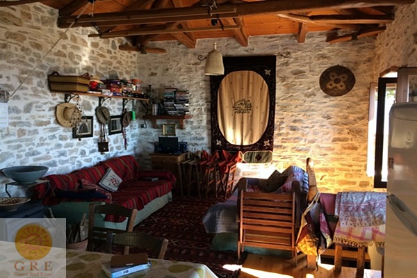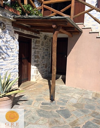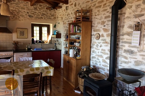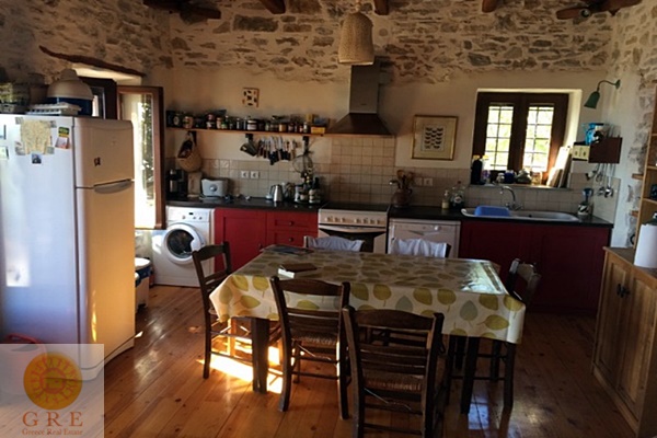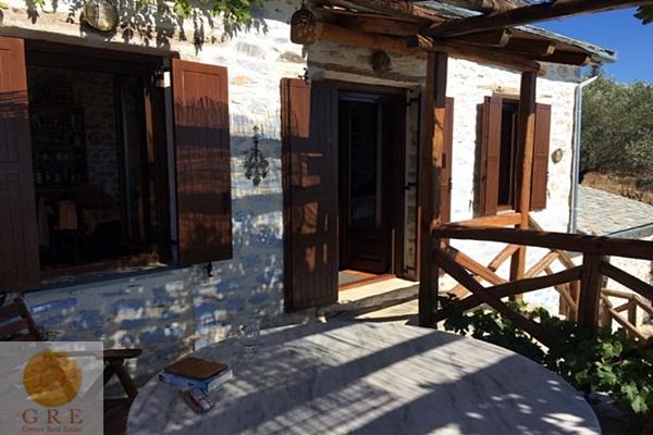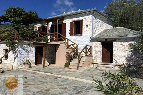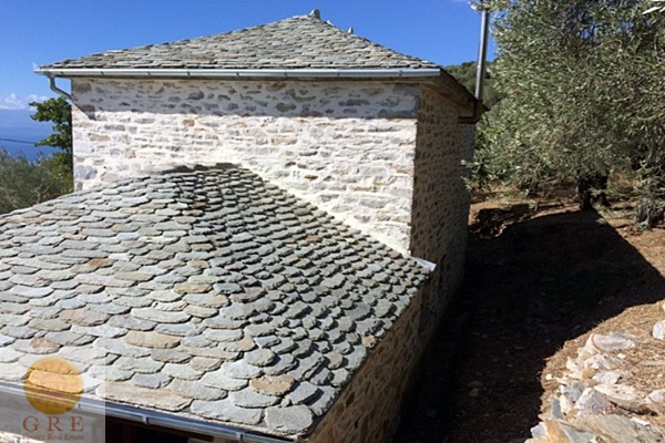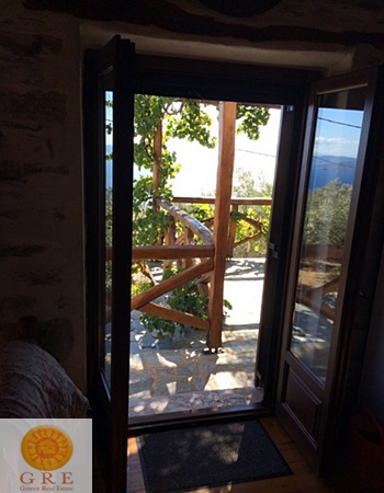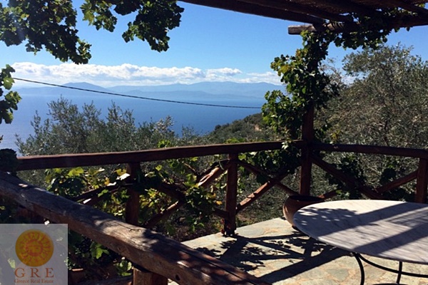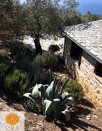 בית אבן מסורתי הממוקם על צלע גבעה, מוקף עצי זית, עם נוף מרהיב של המפרץ פאראסיטיק.