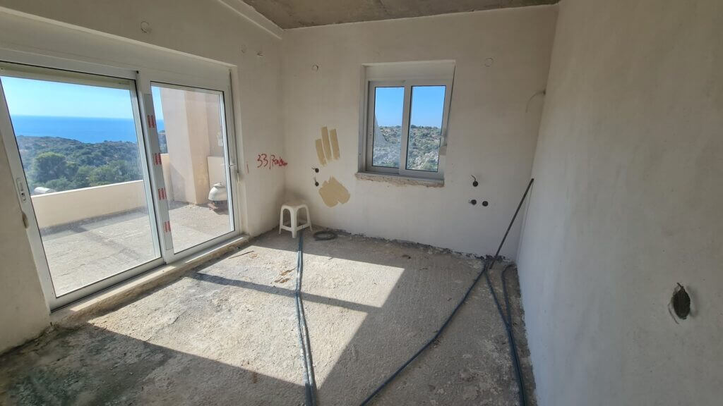 הסלון עם מרפסת של 11.35 מ"ר עם נוף פנורמי לים אינו גמור כיוון שהוא זקוק לאריחים חדשים, ארונות בגדים וכלים סניטריים.
