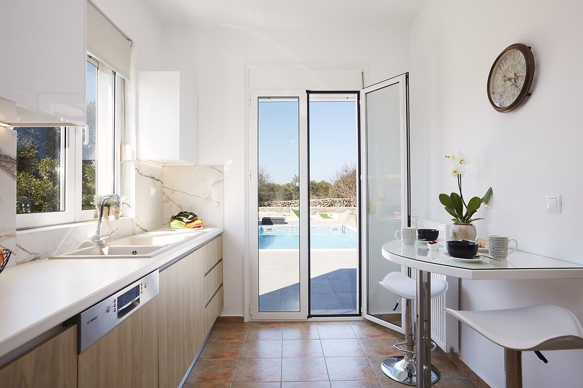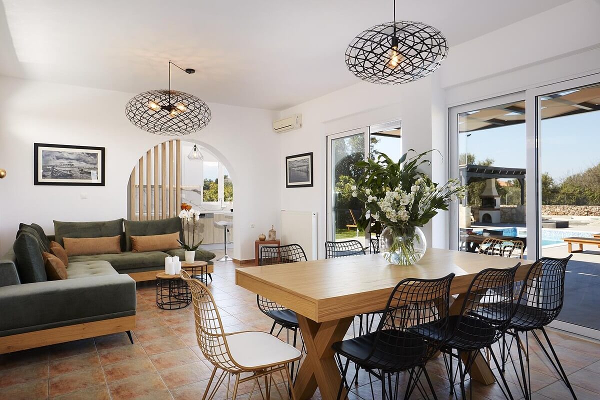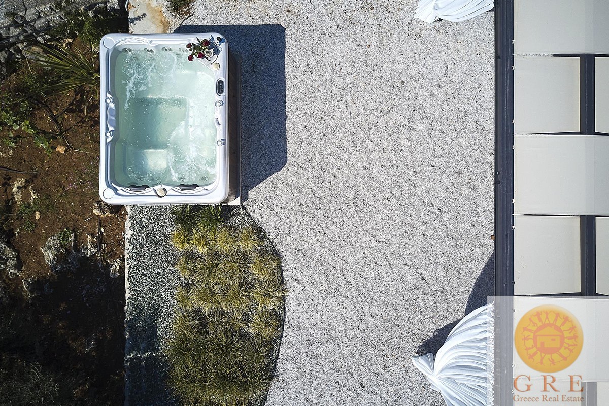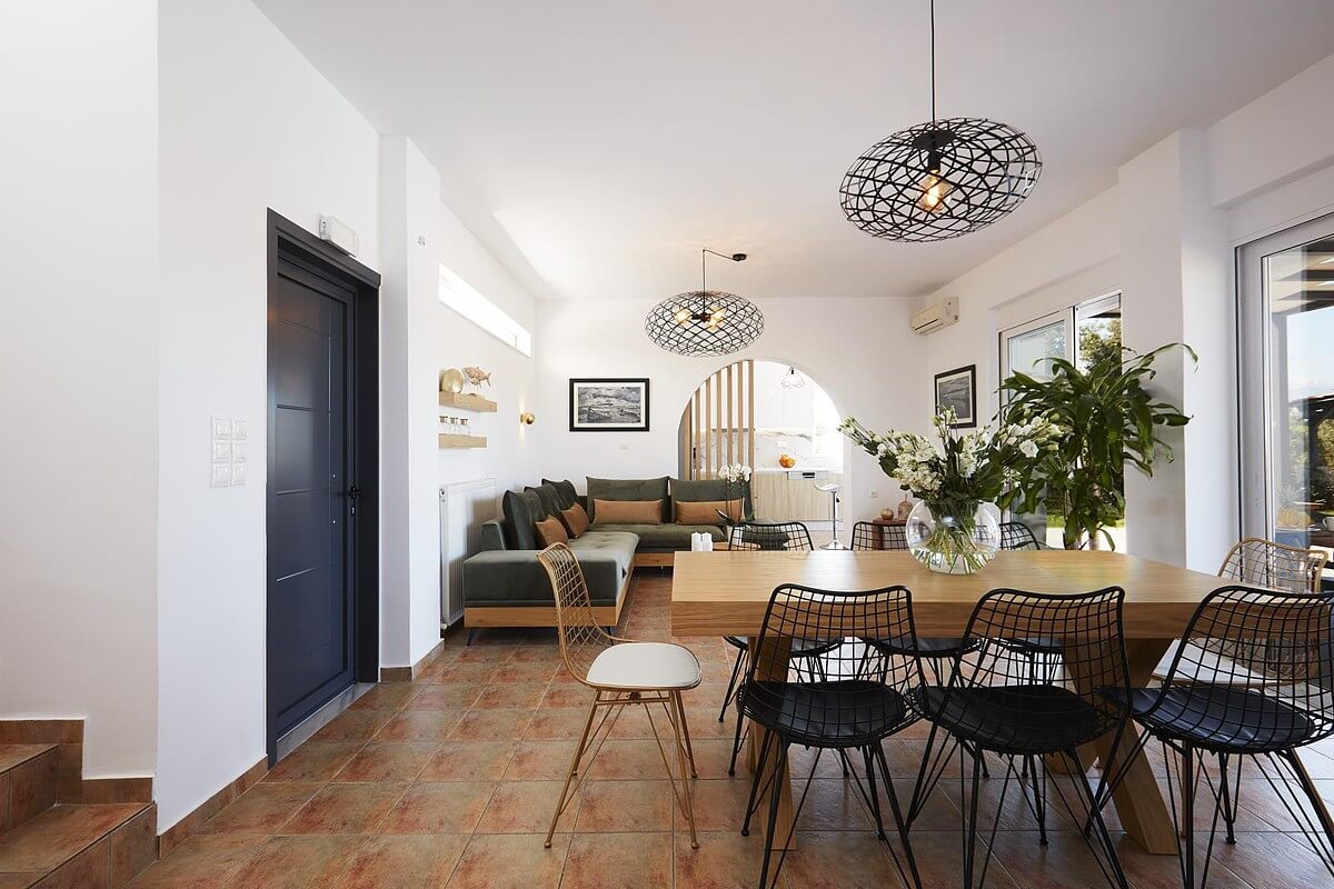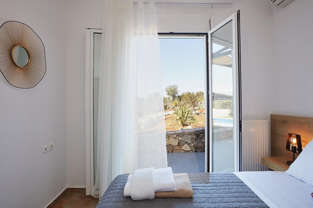 בקומת הקרקע של הוילה, ניתן למצוא אזור אוכל ומגורים מעוצב להפליא,הכולל אח עצים. באותו מפלס, יש גם מטבח מאובזר, 2 חדרי שינה וחדר רחצה. דלתות הזזה גדולות מזכוכית מובילות למרפסת החיצונית, שם תמצאו את פינת האוכל החיצונית וגישה לכל האזורים החיצוניים של הוילה. הקומה הראשונה של וילה זו מורכבת מ-2 חדרי שינה זוגיים. לשניהם יש גישה למרפסות, אחת מהן מקורה בפרגולה ומשקיפה על ההרים הלבנים והים. בנוסף, יש חדר רחצה עם אמבטיה ויחידת מקלחת מותקנת.