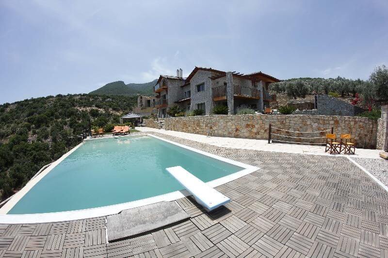 עיצוב חיצוני בנוי מאבן המשתלבת עם הנוף הטבעי, ובו בזמן חושפת את הקווים המסורתיים הפשוטים של הפנים.