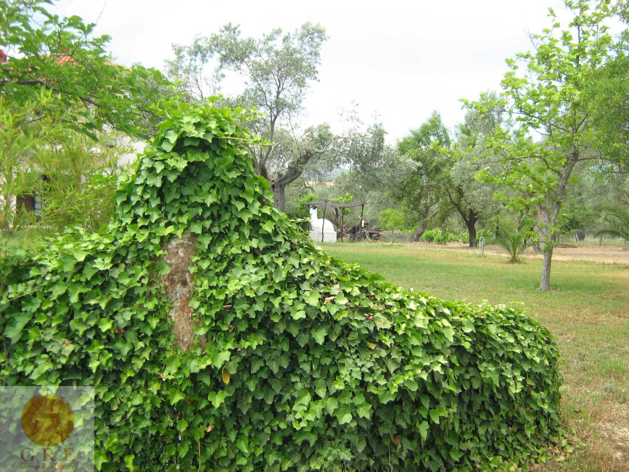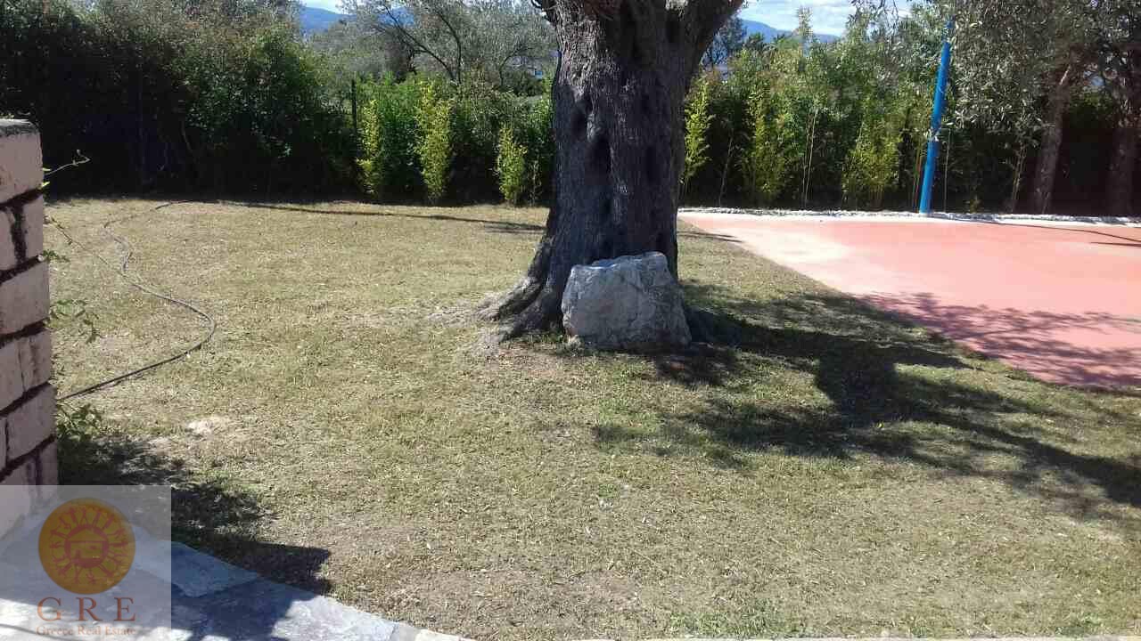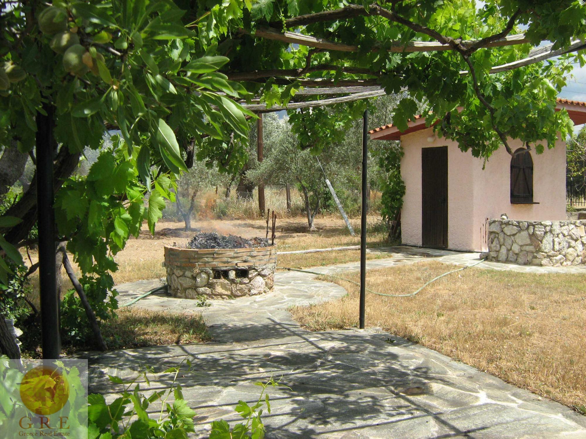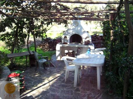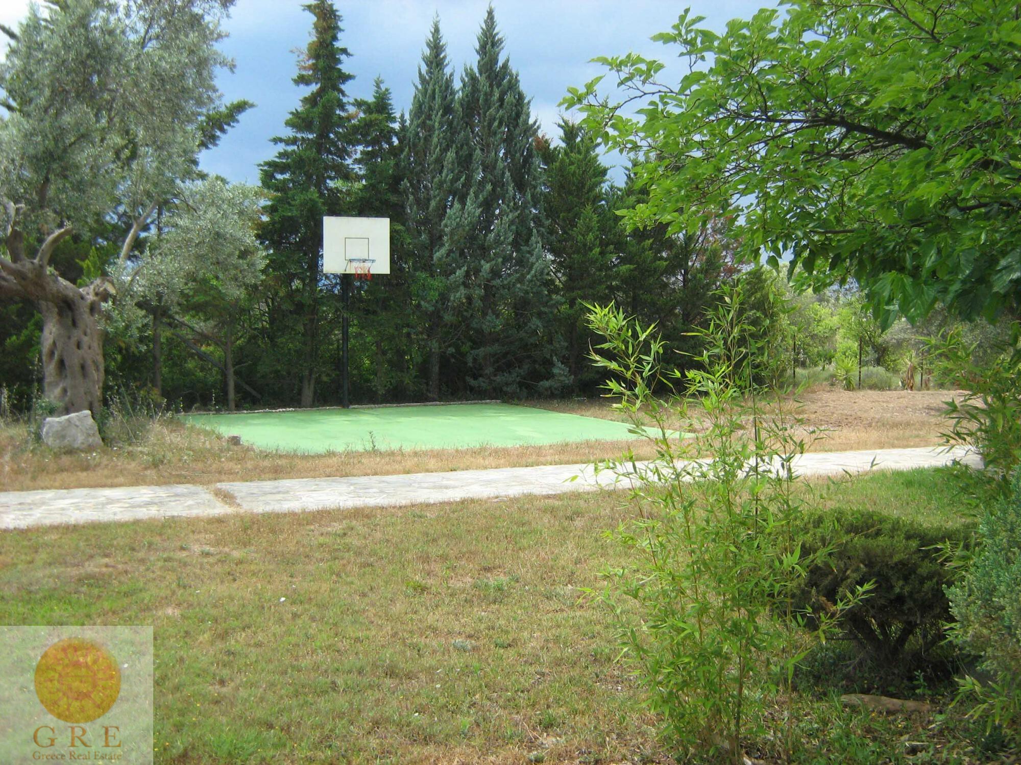 תנור חיצוני מסורתי, מגרש כדורסל, דלת כניסה מתכת וגדר אבן.