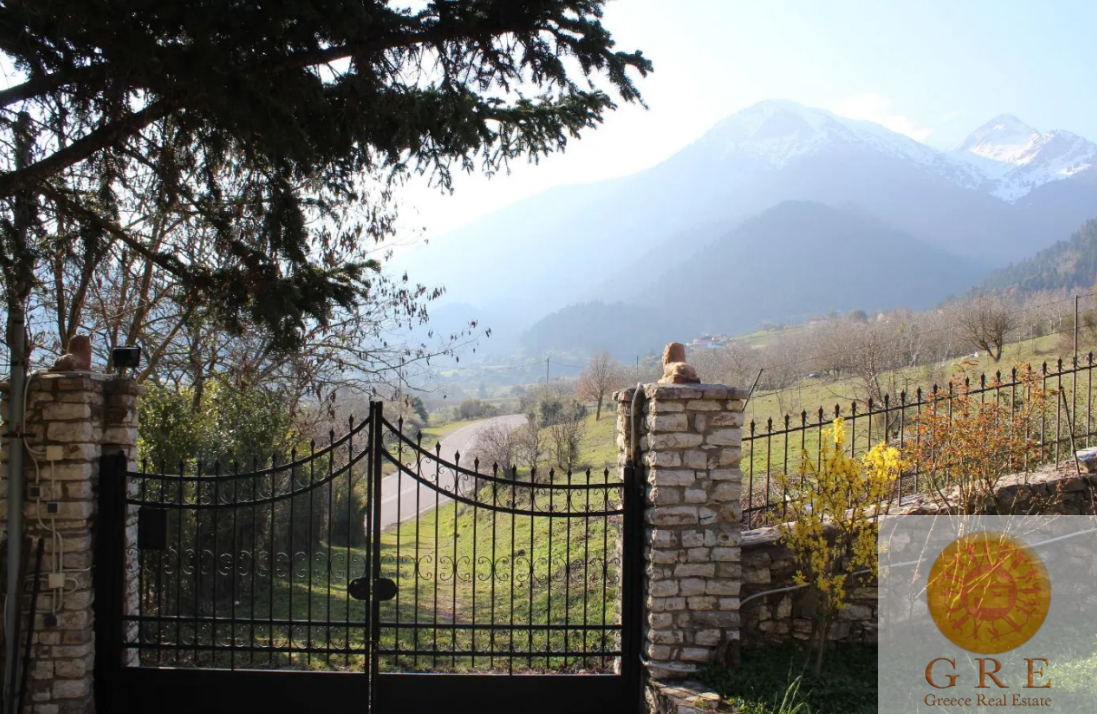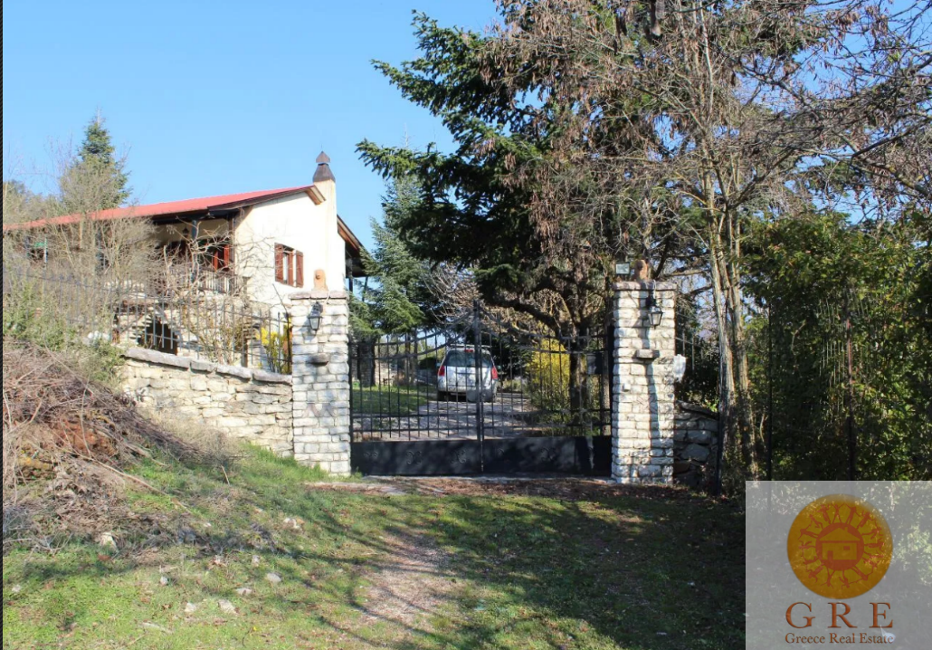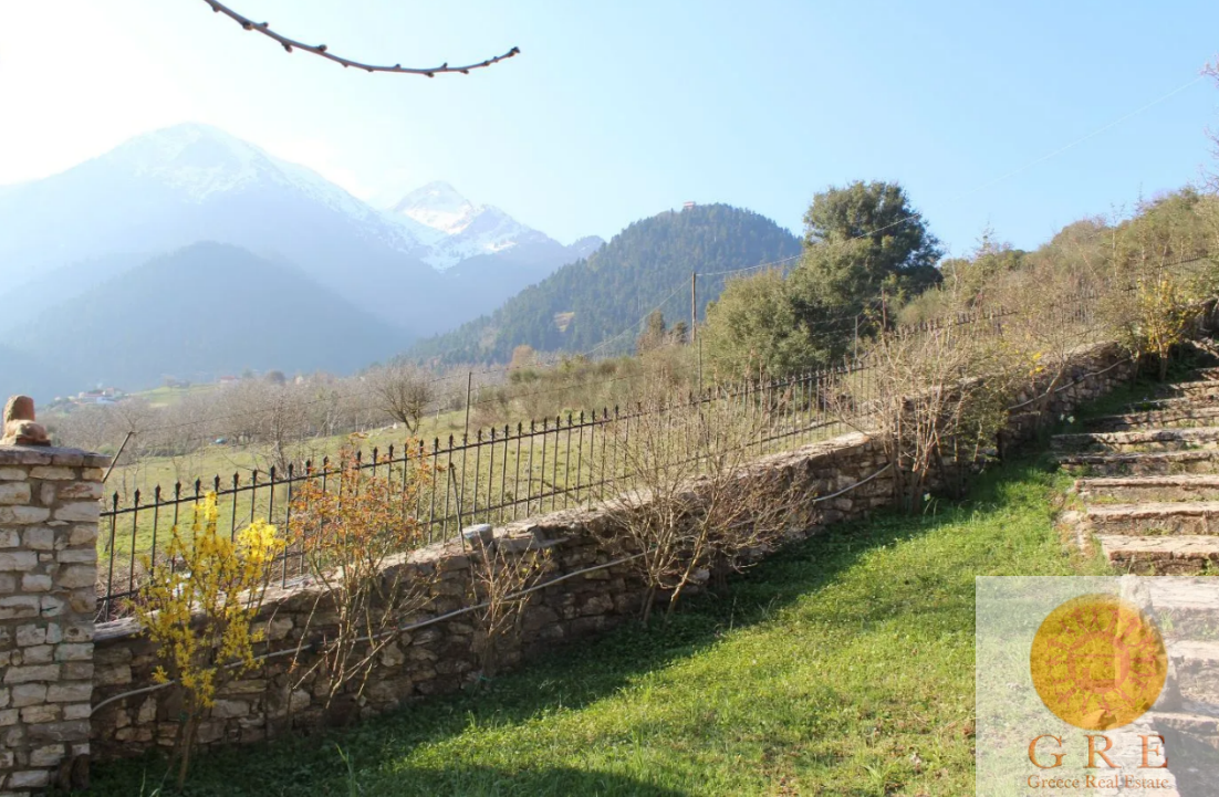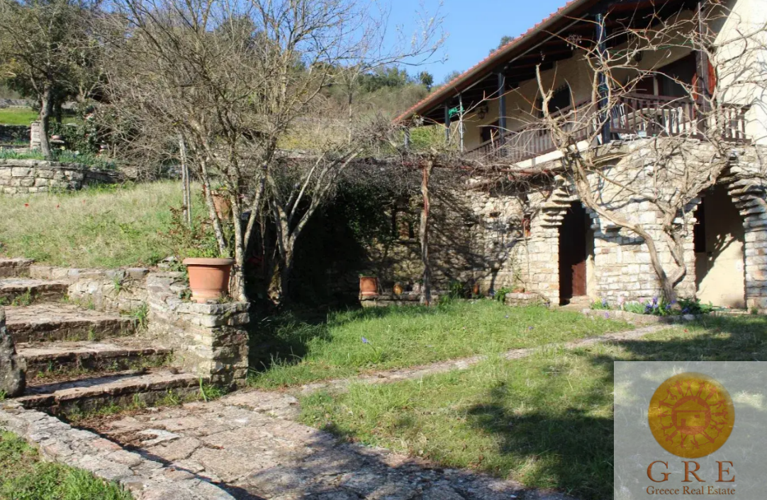 The house is located on a plot of 2129 square meters with stone fences and stone exterior design, a traditional stone barbecue oven, and a canopy for firewood.