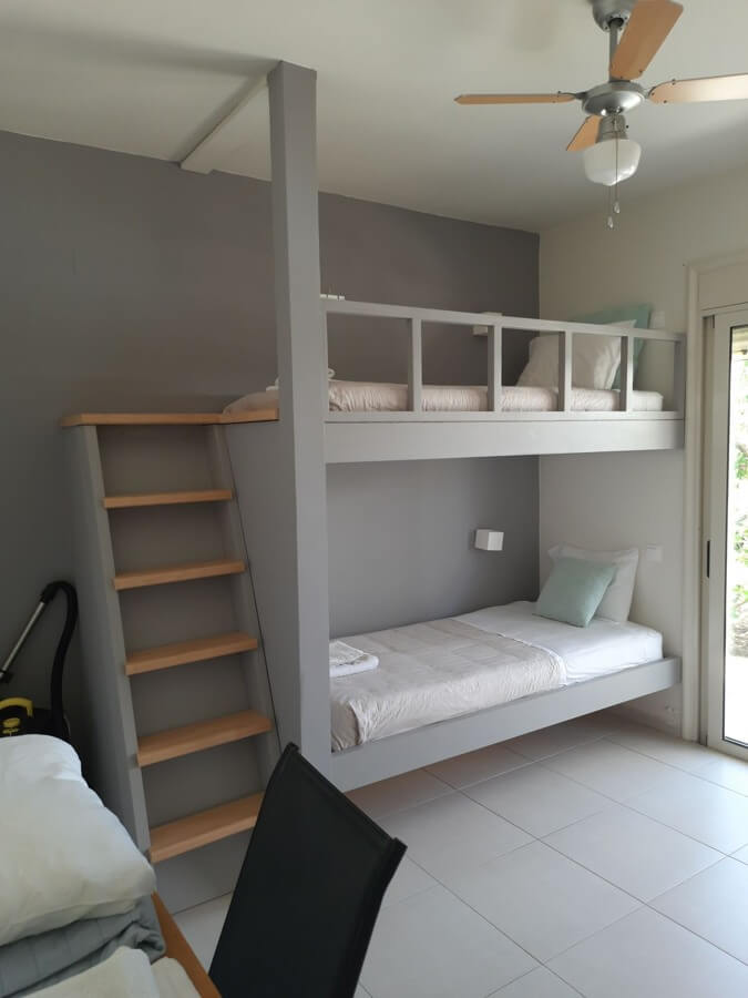 The master bedroom can easily fit a double bed, while the second bedroom has a bunk bed and an office.