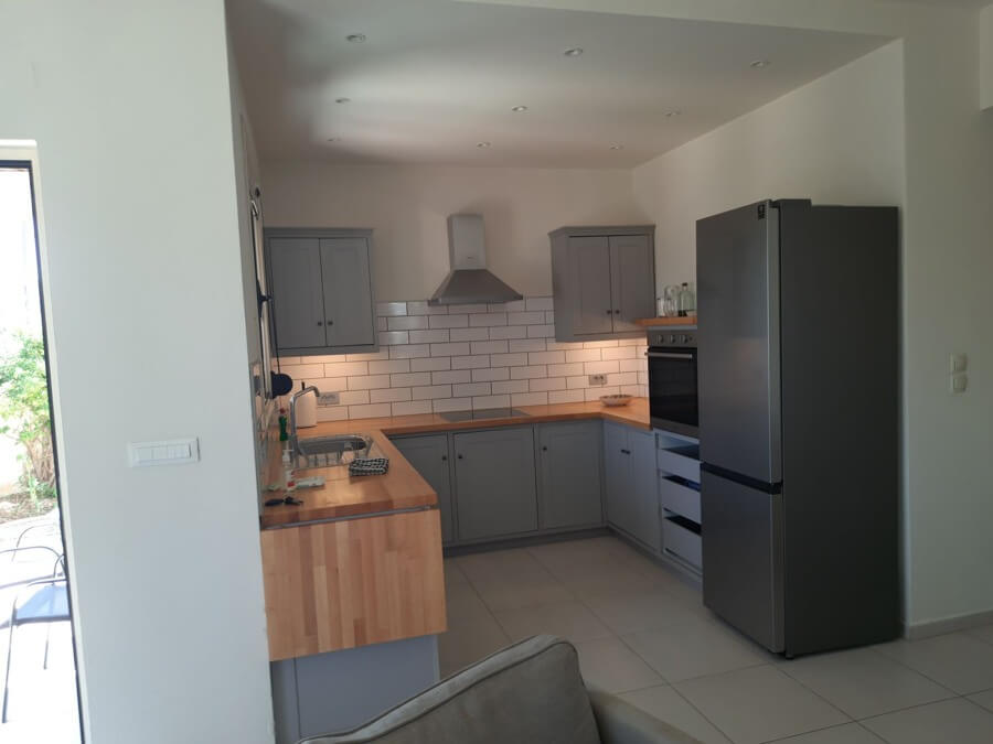 When you go inside, you come to an open kitchen with the living room. The house is furnished, the lounge area includes 2 comfortable sofas and is directly connected to the outside spaces as well, with a dining area for up to 4 people in the middle.